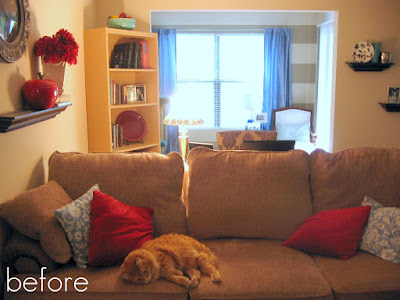 so then i wasn't quite as sad : ) it is adorable to me and the most imprtant thing to remember; it's not red. yesssssss. since i love my fur and glue gun so much i decided my sofa called for a furry pillow as well. i took the red pillows off and i used one to cover the front in fur. the back is still red but you can't really see it, so it's not breaking the rules. it's not! okay, maybe... but i'll probably add a backing and some cute trim.. eventually. so after removing hobbes from his napping place (poor guy) i went to work on the sofa.