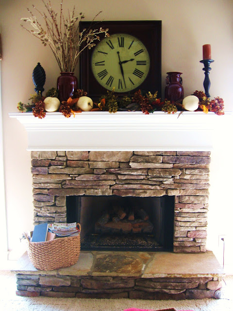 i love the fireplace. it was one of my favorite parts of the house when i first saw it. i love the stone and the giant white mantel. it's all dressed up for fall right now. i helped my mom do the mantel this year, but all the best parts were her ideas. we decided to go somewhat simple and natural-ish. then she added hydrangeas and the pumpkins. then we found those awesome white pinecone things at michaels and she decided she just needed them.. i agree : )