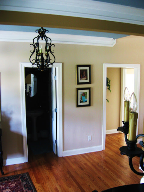 i took this picture to show how the entry way is to the left of the picture, the dark doorway is a bathroom straight ahead, the light doorway right of that is the master, and i took this from the dining room. also, check out the beautiful blue ceiling. love.